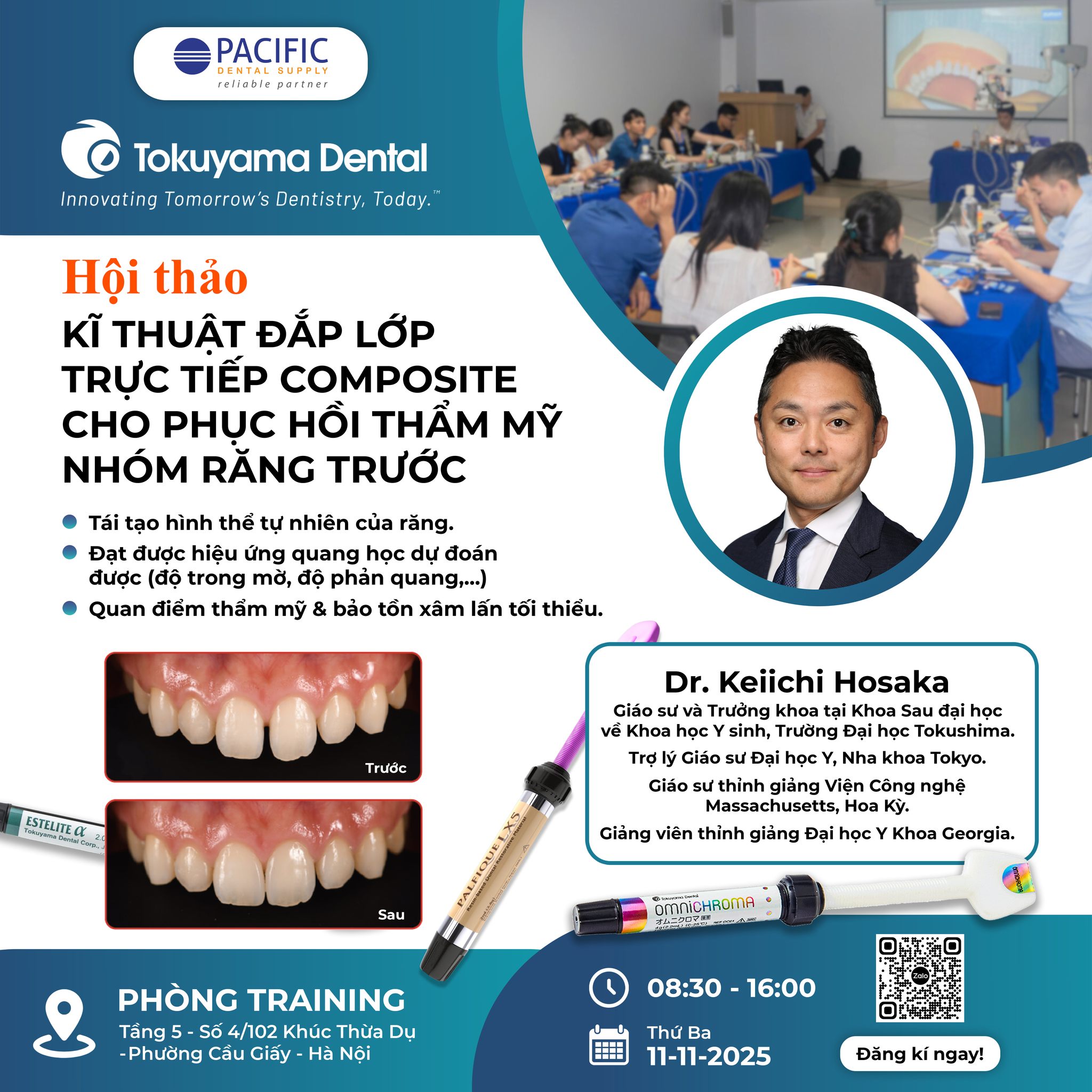 👉 Tháng 11 này, PACIFIC DENTAL kết hợp cùng Tập đoàn Tokuyama Nhật Bản hân hạnh tổ chức hội thảo chuyên đề về Kỹ Thuật Đắp Lớp Trực Tiếp Composite Cho Phục Hồi Thẩm Mỹ Nhóm Răng Trước. Đây là cơ hội để các bác sĩ nha khoa tiếp cận phương pháp phục hồi thẩm mỹ và chức năng răng hiệu quả, thông qua việc sử dụng composite với tối thiểu các màu sắc và kiểm soát chính xác độ dày mỗi lớp.