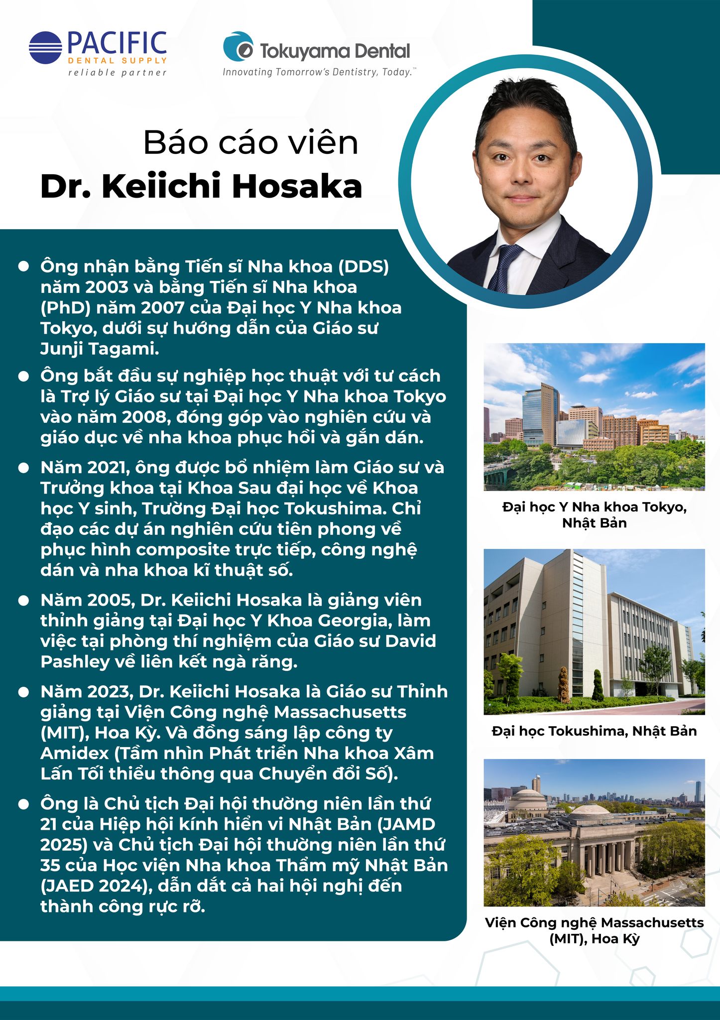 Dr. Keiichi Hosaka là Giáo sư và Trưởng khoa tại Khoa Sau đại học về Khoa học Y sinh, Đại học Tokushima, Nhật Bản. Ông còn là Giáo sư thỉnh giảng tại Đại học Y Nha khoa Tokyo, Nhật Bản, và Giảng viên thỉnh giảng tại Viện Công nghệ Massachusetts (MIT), Hoa Kỳ, Đại học Y Khoa Georgia, Hoa Kỳ. Dr. Hosaka là chuyên gia hàng đầu trong lĩnh vực nha khoa thẩm mỹ, đặc biệt với kỹ thuật đắp lớp composite cho răng trước.
