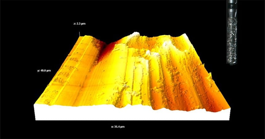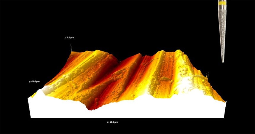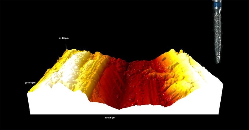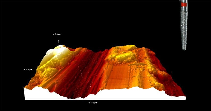 Bề mặt Zirconia sau khi mài bằng kim cương đen Peak-Peak-Hight (Sy): 2273 nm | Độ nhám trung bình (Sq): 292 nm | Phần nhô cao nhiều nhất (Spk): 234 nm | Phần lõm sâu nhất (Svk): 507 nm