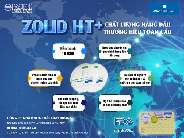 Tại Việt Nam, răng sứ Ceramill Zolid phân phối và bảo hành chính hãng 10 năm từ Công ty TNHH Nha khoa Thái Bình Dương, cùng hệ thống Labo và phòng khám sử dụng rộng khắp trên cả nước, đảm bảo chất lượng và niềm tin tuyệt đối của khách hàng.