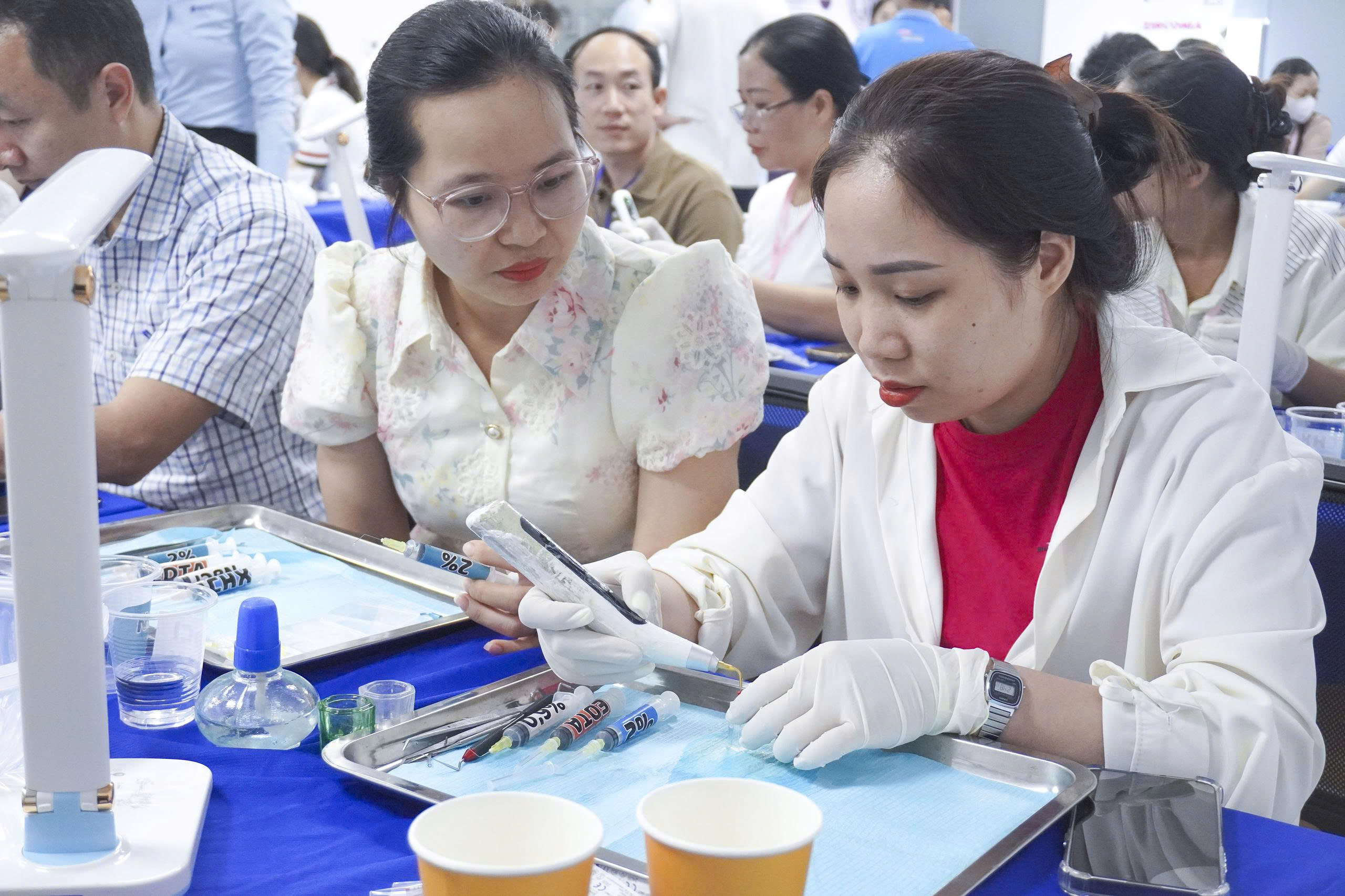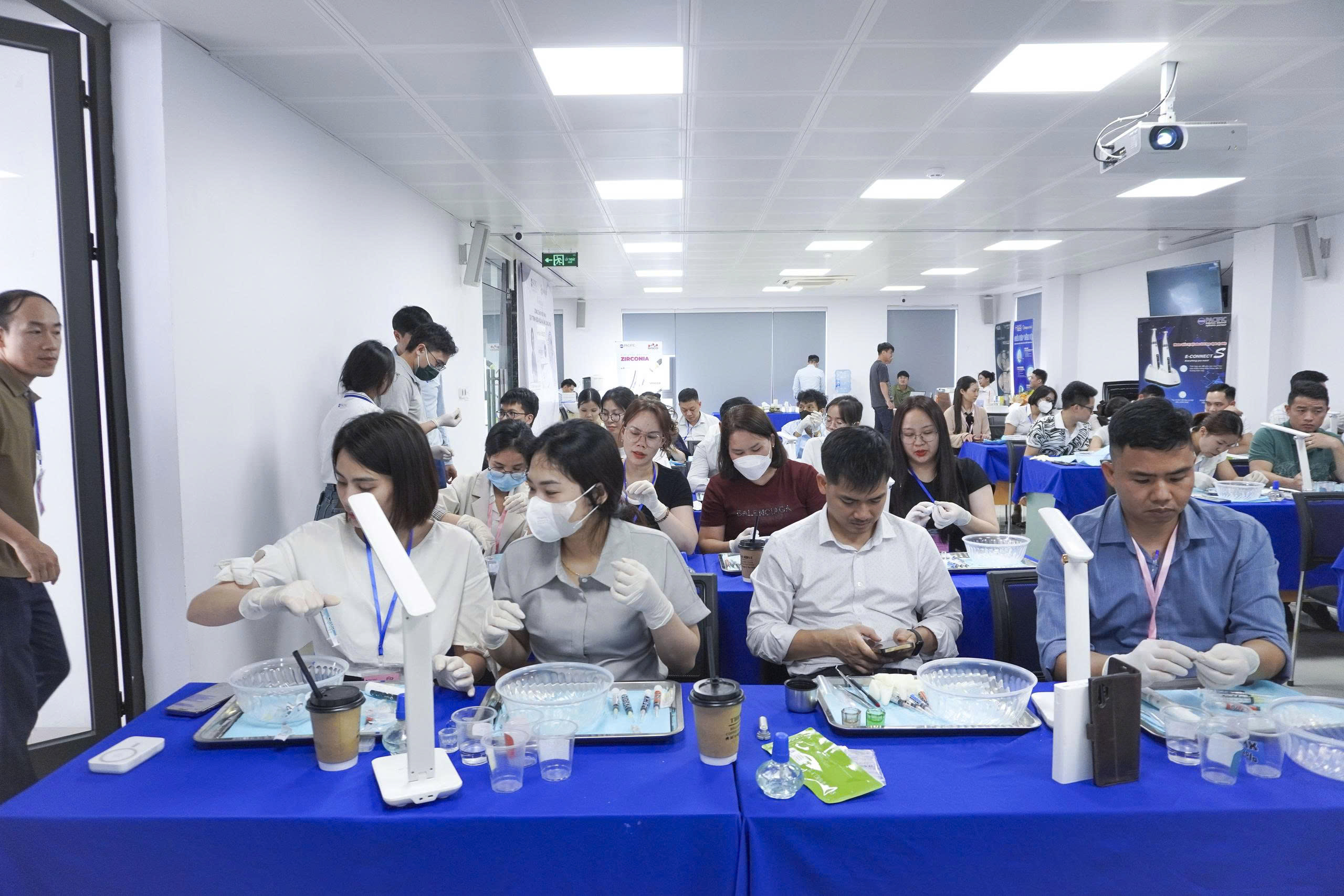 Lý thuyết đi đôi với thực hành - Dưới sự hướng dẫn nhiệt tình và sát sao từ Báo cáo viên, các bác sĩ tham dự đã có cơ hội rèn luyện kỹ năng, giải đáp thắc mắc trực tiếp và cọ xát với các tình huống thực tế, áp dụng kĩ thuật và vật liệu thế hệ mới vào điều trị nội nha bảo tồn.