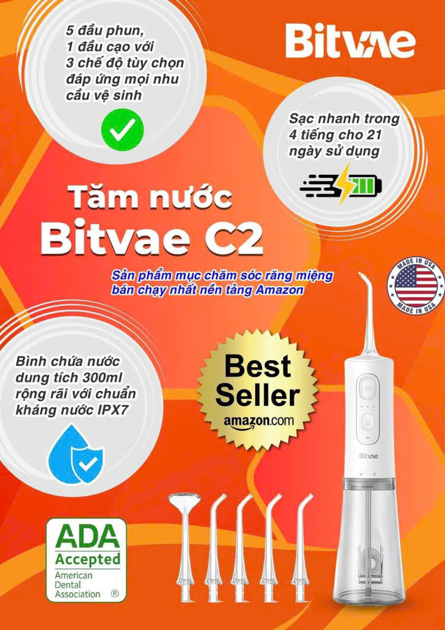 Tăm nước Bitvae C2 – sản phẩm chăm sóc răng miệng đến từ thương hiệu toàn cầu, bán chạy số 1 trên Amazon, đạt chứng nhận ADA Hoa Kỳ – tiêu chuẩn uy tín hàng đầu trong ngành nha khoa. ![]()