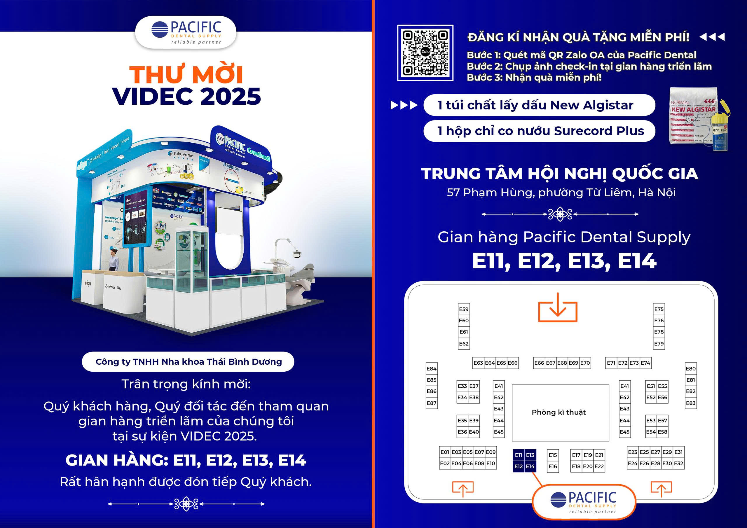 Công ty TNHH Nha khoa Thái Bình Dương trân trọng kính mời Quý bác sĩ, Quý khách hàng và Quý đối tác đến tham quan gian hàng Pacific Dental Supply tại Hội nghị Khoa học Kỹ thuật và Triển lãm Răng Hàm Mặt Quốc tế VIDEC 2025 – sự kiện nha khoa uy tín hàng đầu tại Việt Nam.