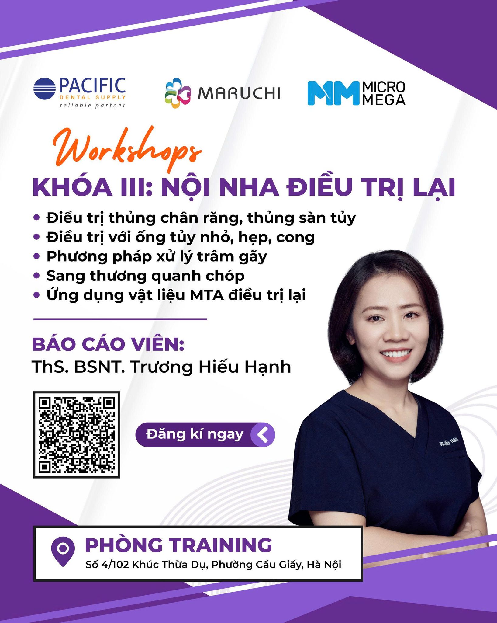Với chuyên đề nâng cao, khóa học do ThS. BSNT. Trương Hiếu Hạnh – nguyên giảng viên Bộ môn Nha khoa Phục hồi & Nội nha, Viện Đào tạo Răng Hàm Mặt, Đại học Y Hà Nội – trực tiếp giảng dạy, hứa hẹn mang đến những kinh nghiệm thực tiễn quý báu và phương pháp tiếp cận chuyên sâu, giúp bác sĩ xử lý hiệu quả các tình huống khó trong điều trị tủy.